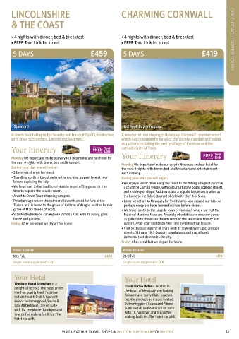 • Peterborough where the cathedral is worth a visit for fans of the • Later we return to Newquay for free time to look around our base or