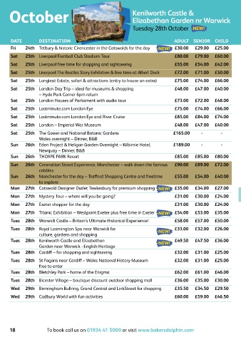 Sat  25th Liverpool free time for shopping and sightseeing  £55.00  £54.00  £42.00  Wed  29th Silverstone Experience Museum - home of British Motor Racing  £60.00  £59.00  £46.00