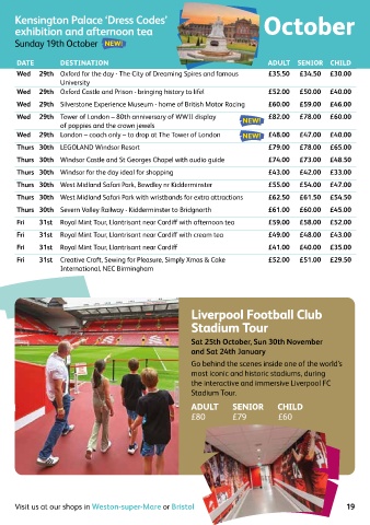 Sat  25th Liverpool free time for shopping and sightseeing  £55.00  £54.00  £42.00  Wed  29th Silverstone Experience Museum - home of British Motor Racing  £60.00  £59.00  £46.00