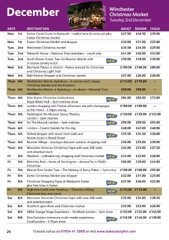 Thurs 4th  London shopping with Festive afternoon tea with champagne   £189.00 £189.00  –  Tues  9th  Salisbury Christmas on The Square and shopping for the day  £35.50  £34.50  £29.00