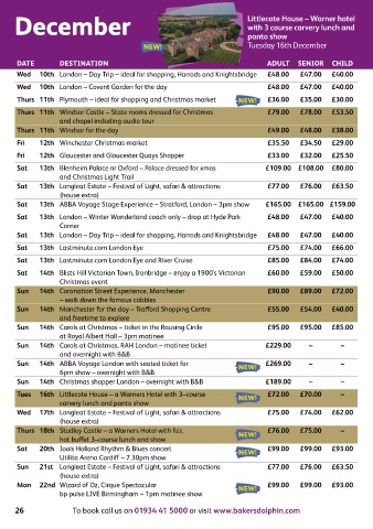 Tues  16th Littlecote House – a Warners Hotel with 3–course    NEW!  £72.00  £70.00  –  Sun  18th Strictly Come Dancing Live – 1.30pm – Birmingham   TBC  TBC  TBC