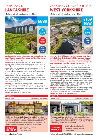 HOLIDAY       • Hotel with Leisure Facilities.         HOLIDAY       •  Live Entertainment each evening.               HOLIDAY       • Emmerdale Country.                     HOLIDAY       • Traditional Christmas lunch.