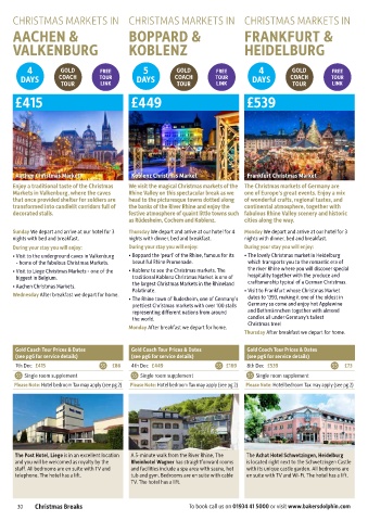 •  Visit to the underground caves in Valkenburg    •  Boppard the ‘pearl’ of the Rhine, famous for its   •  The lovely Christmas market in Heidelburg   During your stay you will enjoy:  During your stay you will enjoy:  cathedral and home to the largest Christmas