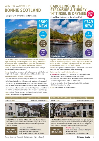5 GOLD FREE £479 5 FREE single rooms • Visit to Fort William with time to explore the beautiful surroundings. • A scenic drive followed by a ‘Spirit of Christmas cruise’ on Loch Katrine,