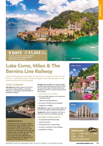 Saturday We travel to Dover for the ferry the Swiss Alps arriving at our hotel in Como