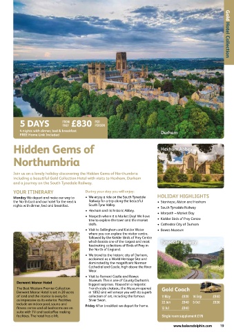 including a beautiful Gold Collection Hotel with visits to Hexham, Durham